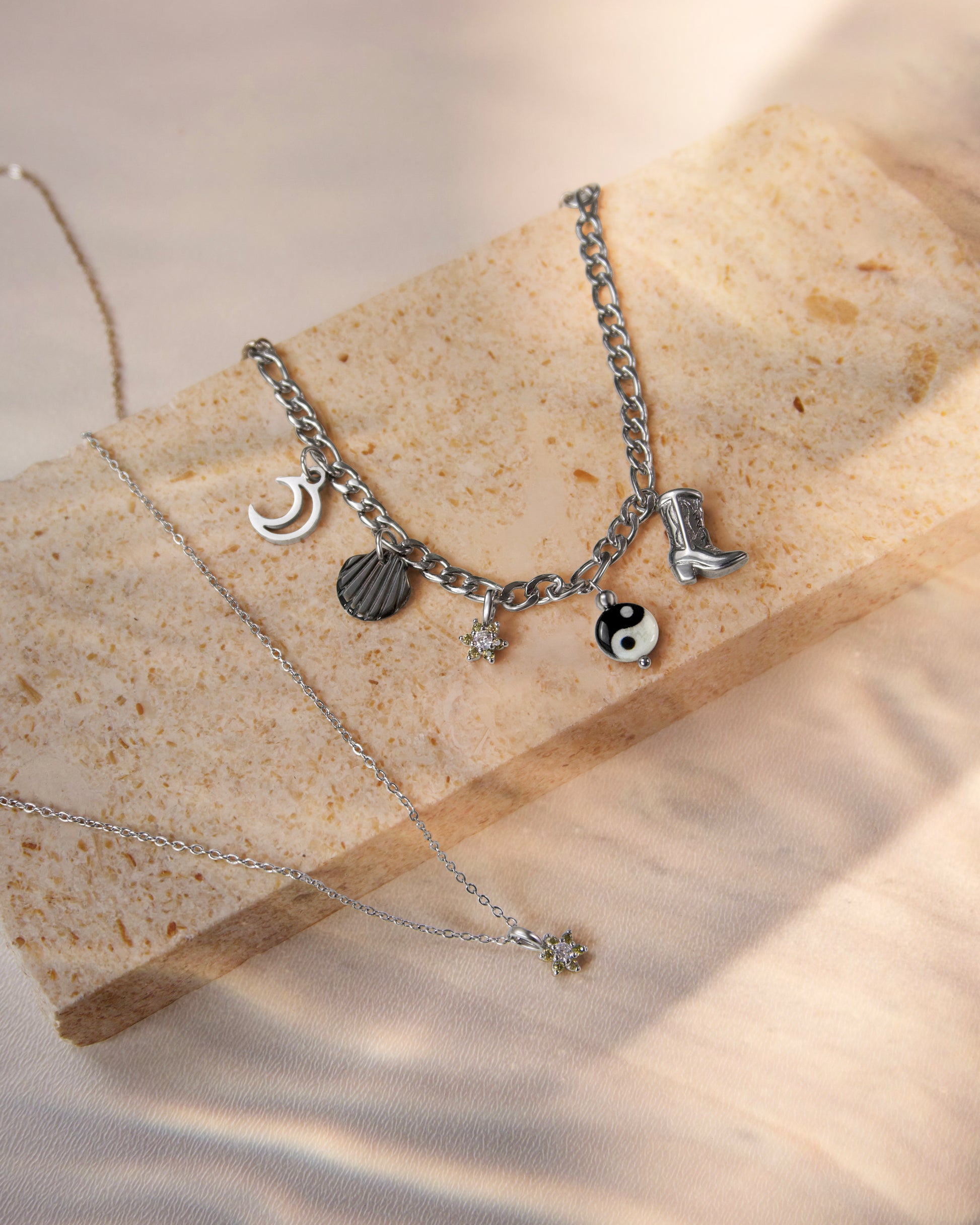 Deze speelse maar elegante bedelarmband is gemaakt van hoogwaardig roestvrijstaal en gevuld met betekenisvolle details. Denk aan een stralende maan, een glanzende parelmoer schelp, een geboortesteen bloem, het Yin & Yang-symbool en een charmante cowboylaars.