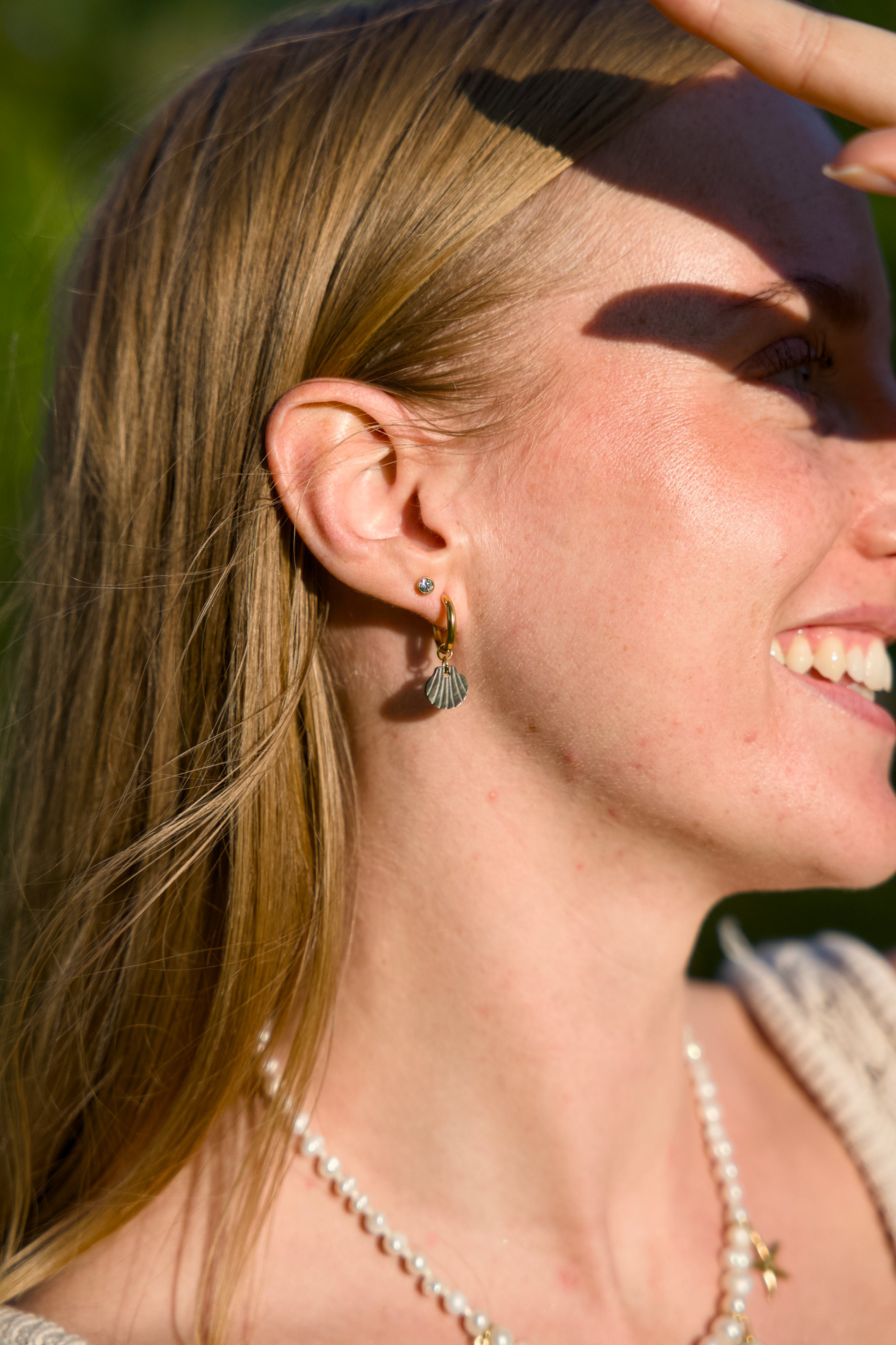 Deze elegante roestvrijstalen oorbellen combineren onze glanzende parelmoerschelp bedel – symbool voor zachtheid en bescherming – met geboortesteen knopjes die jouw verhaal vertellen.