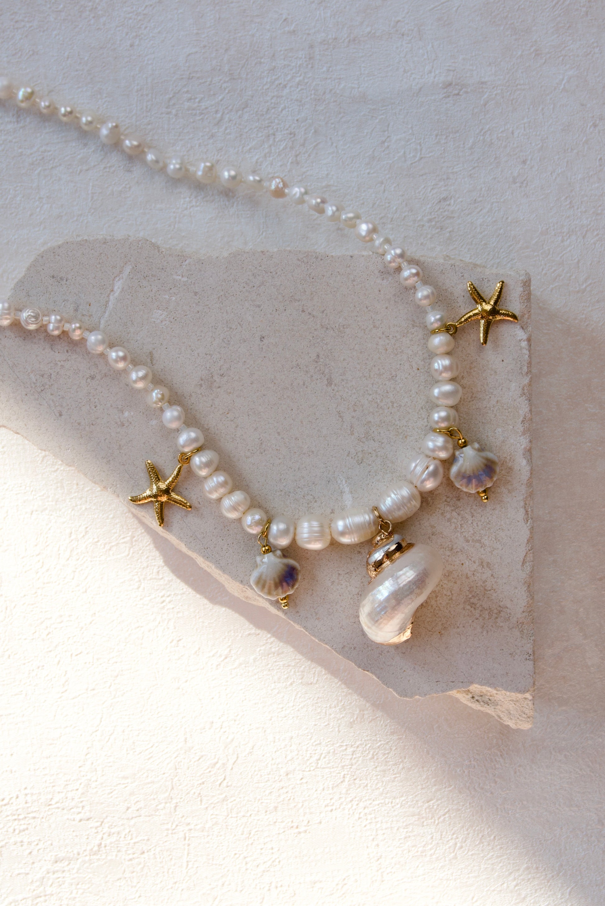 Deze elegante ketting is gemaakt van verfijnde zoetwaterparels, elk met een unieke vorm en zachte glans. De ketting is afgewerkt met speelse strandbedels van roestvrijstaal en schelp, die een subtiele knipoog geven naar zon, zee en strand. Een tijdloos sieraad dat moeiteloos natuurlijke schoonheid en zomerse flair combineert.
